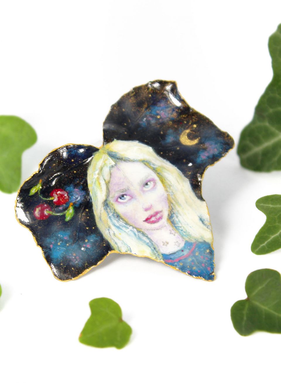 Foglia vera di edera dipinta a mano e cristallizzata. Una delicata e raffinata velatura dorata illumina la superficie ed il contorno del gioiello.