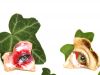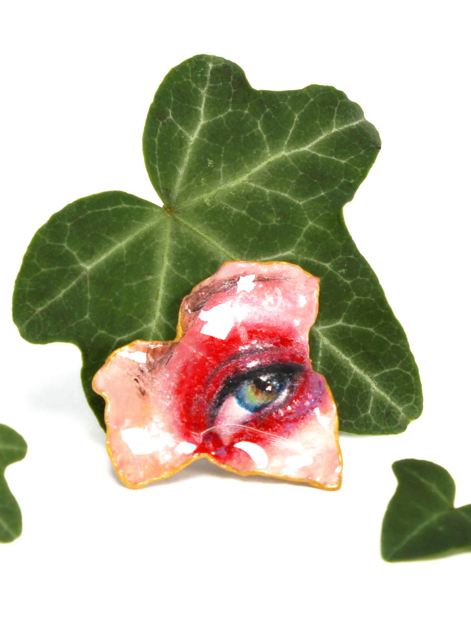 Foglia vera di edera dipinta a mano e cristallizzata. Scintillanti punti luce esaltano le pupille. Raffinati bagliori dorati illuminano delicatamente la superficie ed il contorno dei gioielli.