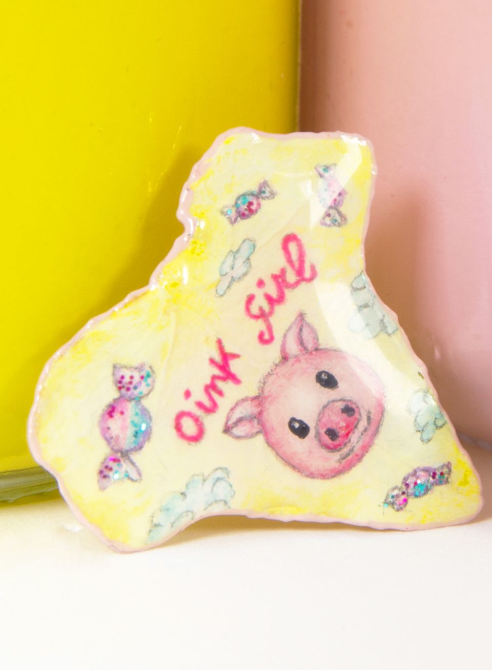 Foglia vera di edera ( Rosa e Golosa ) e geranio ( Tutta Miele ) dipinta a mano e cristallizzata. Scintillanti e coloratissimi punti luce esaltano i particolari delle caramelle, le pupille, i fiori ed il pungiglione. Raffinati e velati bagliori dorati e madreperla illuminano alcuni dettagli e la superficie dei gioielli. Un delicato rosa pastello contorna "Rosa e Golosa". Un raffinato color oro contorna "Tutta Miele".